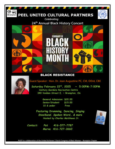 Please join the Congress of Black Women of Canada, Brampton Chapter with the Peel United Cultural Partners as we present the 24th Annual Black History Concert, celebrating Black Resistance.